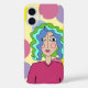 Buntes, helles, abstraktes Design eines stilisierten Mädchens mit gestreiften Haaren, mit einem Hintergrund von Kreisen.