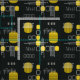 Ein modernes abstraktes Kunstdesign aus der Mitte des Jahrhunderts, das in den 1950er Jahren perfekt in die Welt passte. Verschiedene Formen ovaler Kreise und Linien in gelb und grau auf schwarzem Hintergrund.