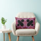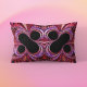 Dieses Lumbalkissen zeigt zwei Spiegelbilder einer wunderschönen Fraktal-Kunst mit schwarzem Prozent-Zeichen auf abstraktem Rot, Rosa und lila Hintergrund.