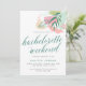 Eine moderne Einladung, die perfekt für ein Wochenende mit Bachelorette am Strand ist. Dieses Design bietet tropische Blätter und abstrakte Formen in Grüntönen, Pinks und Korallen auf einem weißen Hintergrund. "bachelorette wochenende" und der Name der künftigen Braut sind in aquamarinem grün. Auf der Rückseite des Hotels befindet sich eine Route des Wochenendes.