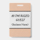 Dieses klassische Abzeichen-Design beinhaltet die Meldung "AUTHORIZED GUEST", einen benutzerdefinierbaren Firmennamen oder eine andere benutzerdefinierte Nachricht. Ein solches Abzeichen könnte vielleicht dazu benutzt werden, anzugeben, dass eine Person ein bekannter und autorisierter Gast oder Besucher eines Unternehmens oder Arbeitsplatzes ist. [~Z0000307]