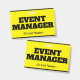 Dieses auffällige Abzeichen-Design beinhaltet die Meldung "EVENT MANAGER". Ein solches Abzeichen könnte vielleicht dazu benutzt werden, zu identifizieren, dass der Träger bei einer Veranstaltung offiziell ist. [~Z0000307]