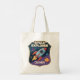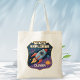 Diese personalisierte Kindertotentasche verfügt über ein kühnes und lebendiges Abzeichen für Entdecker. In der Mitte des Abzeichens befindet sich eine spielerische Cartoon-Rakete, die durch den Weltraum strömt und von Planeten umkreist wird.