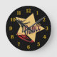 Clock with dancer and the word Dance with large yellow star, and gold numbers on black background. Color of background and numbers can be customized. Red swirl can be removed.