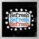 Un design typographique mignon qui dit "Refresh Refresh Refresh Refresh". Il s'agit d'un texte noir, rouge et bleu sur un rectangle blanc avec des points blancs amusants et amusants autour, le tout sur un arrière - plan noir.