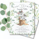 Niedliche Baby Dusche Einladung mit süßem Baby Wolf mit Mama sitzend auf einem Baumstumpf und gerahmt mit natürlichen grünen Aquarell Blätter Set auf einem weißen Hintergrund. Dreh unsere Einladung nach hinten, um ein passendes grünes Blatt für eine besondere Touch zu sehen.