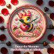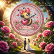 This enchanting circular wall clock features a whimsical 3D digital illustration of an adorable bumblebee with large, expressive blue eyes. The bee wears a pink, heart-patterned bow and holds a shimmering pink heart adorned with smaller red hearts. A cream-colored ribbon banner across the bottom displays the embossed text "Bee Mine" in a delicate red script. The scene is decorated with soft pink roses, green leaves, and a background of shimmering pink light and tiny floating hearts. A thick, solid pink decorative border frames the entire design. The clock face border consists of a light cream ring with black, outlined numbers (1 to 12) and simple black hands centered over the bee.