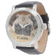 Auf einem großen, beigen Kissen sitzend hübscher Mops-Welpe in kräftigen Farben und auf einer schönen Armbanduhr die Caption iCuddle.