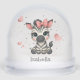 Cute baby shower or birthday snow globe gift or favor featuring adorable little female zebra wearing a cute pink bow sitting on clouds with some love hearts