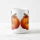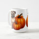 Adorable Mops neben Pumpkins und Blätter sitzen Kaffeetasse