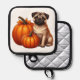 Adorable Mops neben Pumpkins und Blätter sitzen Topflappen