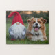 A heartwarming and realistic digital render featuring a charming plush gnome sitting beside a happy, fluffy dog. The gnome wears a tall, textured red hat and has a long, soft white beard. Beside it, a brown and white dog with a joyful expression and its tongue out lies comfortably on a lush green lawn.