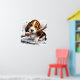 Niedlicher Basset-Hund, der beim Schneefall mit einem Stock im Schnee den Schneefall genießt. Mit einer herzzerwärmenden Winterlandschaft mit Schneeflocken und einem spielerischen Ausdruck für Freude und Wärme.