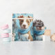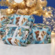 Niedliche Pitbullwelpen auf hellblauem Hintergrund mit Schneeflocken und Grünpflanzen, mit einem blauen Winterschal.. und einem roten Bogen, dem beststen Papier, um Ihre Geschenke in diesem Jahr zu verpacken, ein Muss für Pitbullfamilien oder Hundefreunde - - A © WhimsicalArtwork™ original -