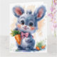 Schicken Sie die süßesten Wünsche mit dieser bezaubernden Kunskarte des Babyhase! Mit einem einzigartigen Design eines niedlichen Hasen mit großen Augen, die eine Karotte halten, in einem wunderschönen, weichen Aquarell-Effekt. Diese hübsche Illustration eignet sich perfekt, um ein neues Baby zu empfangen, eine Babydusche zu feiern, ein Kind zum Geburtstag zu begehen oder eine schöne "nur weil" Notiz zu schicken. Der sanfte und liebenswerte Stil macht es zu einer angenehmen Wahl für jeden Anlass, kleine zu feiern.