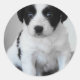 Niedliches Porträtfoto eines Schwarz-Weiß-Welpen, der leichtfertig für die Kamera sitzt.