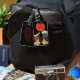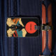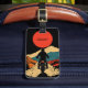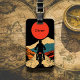 Stylized illustration of a motorcyclist riding toward distant mountains under a bold red sun. The vivid colors and minimalist lines create a sense of freedom and exploration, making this design an ideal choice for a luggage tag that reflects adventure and travel spirit.