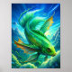 Auf dem Bild schwimmt ein lebendiger grüner Fisch anmutig durch einen strahlend blauen Himmel und trotzt den Naturgesetzen. Die Skalen der Fische glänzen im Sonnenlicht und reflektieren die smaragdgrünen und Limonen Schattierungen. Seine Flossen sind breit verteilt und schaffen ein Gefühl von Bewegung und Eleganz, während es durch die Luft gleitet. Im Hintergrund treiben flauschige weiße Wolken, die die surreale Atmosphäre der Szene verstärken. Die Kombination von Fisch und Himmel schafft ein skurriles und bezauberndes Bild und lädt die Zuschauer ein, sich eine Welt vorzustellen, in der alles möglich ist.