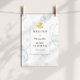 Bienvenue dans votre baby shower avec cette belle affiche, avec un cadre bleu entouré de bulles et un canard en caoutchouc jaune. Ajoutez le nom du client d'honneur, la date de la douche et le texte de bienvenue personnalisé en utilisant les champs fournis.