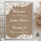 La collection rustique burlap & vintage white lace mariage est un design étonnant avec un joli arrière - plan rustique effet burlap avec un habillage romantique vintage effet de dentelle blanche. Ce panneau de bienvenue peut être personnalisé pour votre occasion spéciale et ferait la signalisation parfaite pour tout mariage rustique, douche nuptiale, fête de fiançailles, fête d'anniversaire et bien plus encore. Les éléments correspondants se trouvent dans la collection.