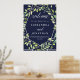 Cet élégant panneau d'accueil de mariage présente un cadre géométrique à l'aspect argenté et moderne, avec une couronne verte à la mode remplie de feuilles sur un arrière - plan bleu nuit.