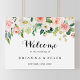 Cette simple enseigne d'accueil mariage de feuillage vert floral est parfaite pour un mariage tropical. Le design présente de beaux roses blancs, roses et blush peints à la main et incrustés dans un feuillage vert, une beauté artistique inspirante. Faites de cette affiche votre propre en ajoutant le nom de la mariée et du marié, ainsi que la date du mariage.