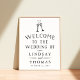Bienvenue dans votre mariage avec notre affiche chic et douce, disponible en plusieurs tailles. Le design présente une typographie noire sur un blanc immaculé avec "bienvenue au mariage de" et vos noms et votre date mariage en dessous, surmonté d'une paire de flûtes de champagne illustrées, jointes par un coeur effervescent.