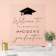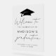 Signe moderne de fête de graduation avec une casquette noire en haut avec accents manuscrits sur un arrière - plan acrylique transparent. Personnalisez le simple panneau d'obtention de diplôme avec le nom du diplômé, le nom de l'école et l'année de fin d'études ci-dessous. Le panneau acrylique tendance est parfait pour les diplômés du secondaire et du collège!