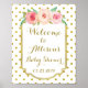 Texte personnalisé affiche d'accueil pour baby shower ou fête d'anniversaire en points blancs et or motif avec bordure or, rose rustique et fleurs d'aquarelle pêche et lettrage de style manuscrit.