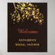 Élégante affiche de bienvenue pour une fête de mariage avec un thème d'automne. Elle présente une branche d'arbre et des feuilles avec une texture dorée. Ce design chaleureux et élégant est parfait pour une fête de mariage pendant cette belle période de l'année. Le fond texturé marron ajoute un aspect rustique.