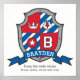Affiche de monogramme de lettre B de style bouclier de chevaliers parfaite pour la chambre ou la salle de jeu d'un garçon dans des nuances de rouge, bleu, blanc et gris. Personnalisez avec le nom de votre enfant et la signification de son nom pour un touche personnelle dans la chambre ou la nurserie de votre enfant, cet exemple est pour le nom Brayden "de la large vallée". Large, courageux, intelligent et sage. Impression d'affiche idéale comme cadeau pour un nouveau-né, pour un baptême, une cérémonie de nomination de bébé ou une fête prénatale. Dessin de bouclier unique, art graphique, recherche de nom, formulation et conception par Sarah Trett. www.sarahtrett.com pour www.mylittleeden.com