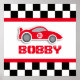 Affiche de chambre ou de nurserie de sport automobile de voiture rouge amusante et de drapeau à damier pour garçons. Idéal pour une chambre ou une salle de jeu de fan de sport automobile ou de course automobile ou une chambre d'enfant. Personnalisez cet article avec le nom de votre enfant et le numéro de votre choix. Cet exemple indique : Bobby 01. Une excellente idée de cadeau pour une nouvelle chambre de garçons et pour les fêtes prénatales pour bébé garçon. Conception graphique et design de Sarah Trett.