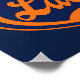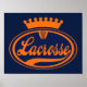 La crosse est King. Cool, signalétique rétro. Oval avec lettrage cursif du mot crosse avec symbole de bâton de crosse à l'intérieur. Orné d'une couronne vintage. Poster de crosse. Version : orange et bleu.