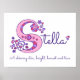 Jolie affiche de nom avec monogramme S, parfaite pour la chambre ou la salle de jeux d'une fille dans des tons de blanc, rose et violet. Personnalisez avec le nom de votre enfant commençant par S, et la signification du nom pour un effet vraiment personnalisé dans la chambre ou la nurserie de votre enfant, cet exemple est pour le nom Stella Une étoile brillante, lumineuse, honnête et vraie. Jolie impression idéale pour un nouveau-né, un baptême ou un cadeau de baby-shower. © Dessin unique de cœurs et de fleurs avec monogramme S et description et conception graphique de Sarah Trett. www.sarahtrett.com pour www.mylittleeden.com