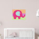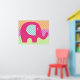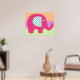 Une affiche colorée de nurserie présente un éléphant rose vif avec des oreilles à points sarcelle et blanc et un fond avec des points orange, lavande et vert.