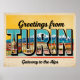 Mettez en valeur l'élégance de Turin avec cette illustration de style carte postale rétro. « TURIN » apparaît en lettres majuscules grasses remplies de miniatures de la Mole Antonelliana, du Palais Royal, de la Piazza Castello et des Alpes enneigées. Le fond coloré capture l'architecture classique de Turin et les vues alpines. Idéal comme affiche murale pour les amateurs du nord de l'Italie.