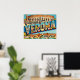 Plongez dans la ville romantique de Vérone avec cette illustration de style carte postale rétro. « VÉRONE » apparaît en lettres majuscules grasses remplies de minuscules images de l'Arène romaine, du balcon de Juliette et du pont Castelvecchio. L'arrière-plan montre l'Arène et des rues animées dans un style vintage coloré. Parfait pour célébrer la ville italienne de l'amour.