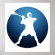 Tireur de crosse. Verrouillé, coincé et prêt à rocher. Silhouette du joueur de crosse tenant le bâton, au milieu de tirer un tir sur le but. Conception d'emblème circulaire en blues avec rayons émanants. Impression de l'affiche de crosse.