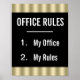 Affiche humoristique noire et or "Règlement intérieur de bureau". Vous pouvez personnaliser cette affiche drôle en changeant la couleur de fond et en ajoutant votre texte pour lui faire dire ce que vous voulez. Ça a l'air super avec un cadre noir !