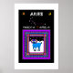 Mignonne, colorée, et oh si Whimsical. Poster "Aries the Ram" 12" x 18" réalisé dans un style de dessin animé super adorable. Nous trouvons notre joyeux personnage de dessin animé bleu Ram, qui a juste les cornes les plus mignonnes et les plus colorées, juste allongé dans la neige sous un ciel étoilé. Au-dessus des couches de cadres très minutieusement décorées, à inclure des pois, des triangles et des rayures dans des couleurs de violet massif, des rayures noires avec des pois blancs, une fine bande violet clair, une bande bleue légèrement plus épaisse, une bande violette avec des pois blancs, une bande orange solide, alternant triangles bleu et jaune et se terminant par une bande rose, se trouve la constellation Aries. Dans les coins sont alternativement des soleils et des lunes. Au sommet se trouve un autre soleil et une autre lune de chaque côté du titre de l'oeuvre d'art - "ARIES"