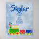 Affiche de nom de Skylar sur arrière - plan d'aquarelle bleu, avec un train de jouets coloré et texte personnalisable. Les adjectifs commencent par chaque lettre du nom choisi. Vous pouvez customiser les adjectifs pour ce nom ou choisir un autre nom et les adjectifs correspondants. Ou vous pouvez me contacter pour customiser une affiche avec votre nom de choix. REMARQUE : en customisant, le nom supérieur est écrit deux fois (une fois en bleu et une fois avec une "ombre" plus légère) pour le faire ressortir.