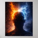 Une silhouette se dresse au centre d'une puissante transformation, où le feu et l'eau jaillissent de l'esprit dans un spectacle saisissant de contrastes. Un côté brûle avec intensité et passion, tandis que l'autre s'écoule avec calme et clarté, se rencontrant en un point radieux d'équilibre.