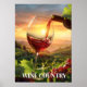 L'affiche est montrée avec une photo d'art d'un gobelet de vin et de raisins dans une cave avec un beau coucher de soleil de la campagne viticole. Customisez cet objet ou achetez tel quel. Image sous licence