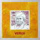 Un portrait de Giuseppe Verdi, le grand compositeur italien. L'arrière - plan énumère quelques-unes de ses oeuvres les plus connues comme Aida, La Traviata, Nabucco, Rigoletto, etc.