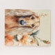 Beautiful and fun jigsaw puzzle for dog lover with a watercolor portrait of an Afghan Hound dog sitting against lovely peach colored lilies flowers.