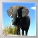 Afrikanischer Elefant mit Stoßzähnen am blauen Himmel.