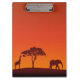 Afrikanischer Safarilandschaftshintergrund, der Silhouetten einer Giraffe, des Baums und des Elefanten gegen den Sonnenuntergang in den orange und rote Farbschatten kennzeichnet.