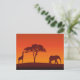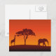 Afrikanischer Safari-Landschaft mit Silhouetten einer Giraffe, einem Baum und einem Elefanten vor dem Sonnenuntergang in Orange- und Rottönen.