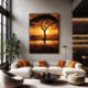 Eine ruhige afrikanische Landschaft bei Sonnenuntergang mit einem großen Akazienbaum, der gegen die untergehende Sonne versilbert ist. Das goldene Licht und die üppige Vegetation schaffen eine Atmosphäre der Ruhe und der natürlichen Schönheit.