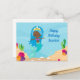 Niedliche, individuell schwarze Geburtstagskarte mit einem hübschen, blauen Haarbild-Amerikanerin mit einem coolen aquamarinen Schwanz, der neben einer schönen, hellen Koralle im Ozean schwimmt. Coole Geburtstagskarte für ein Party oder ein Strandmädchen.